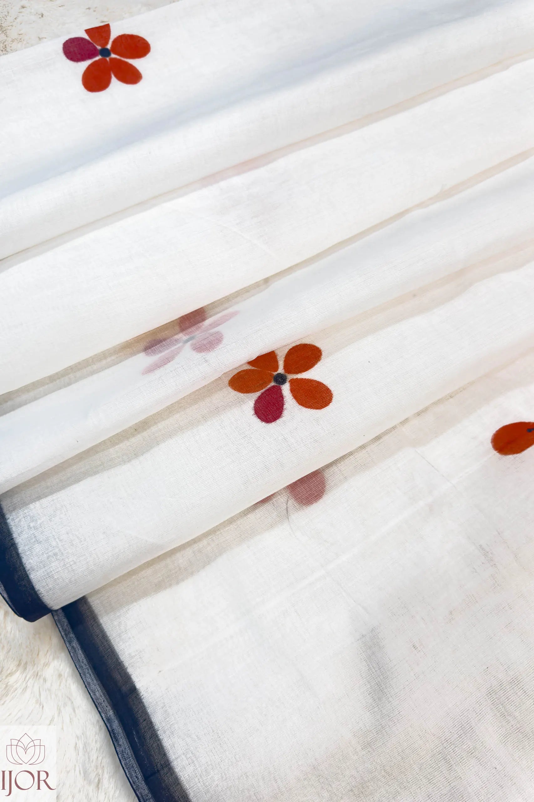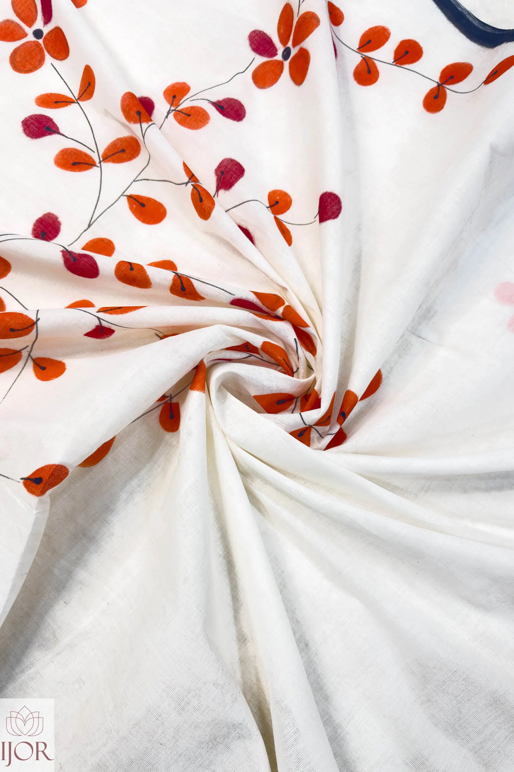 Bring art to your wardrobe with our Hand-Painted Pure Mulmul Cotton Saree. Crafted from the softest mulmul cotton, this saree is light, breathable, and perfect for all-day comfort. Adorned with vibrant red floral motifs and delicate hand-painted detailing, it carries the charm of artisan craftsmanship. The black piping along the borders adds a graceful finishing touch, making it elegant for festive gatherings, cultural events, or casual occasions. With a length of 5.5 meters, it drapes beautifully and offers timeless appeal. A perfect pick for women who love wearing unique, hand-painted creations that blend tradition with style.
