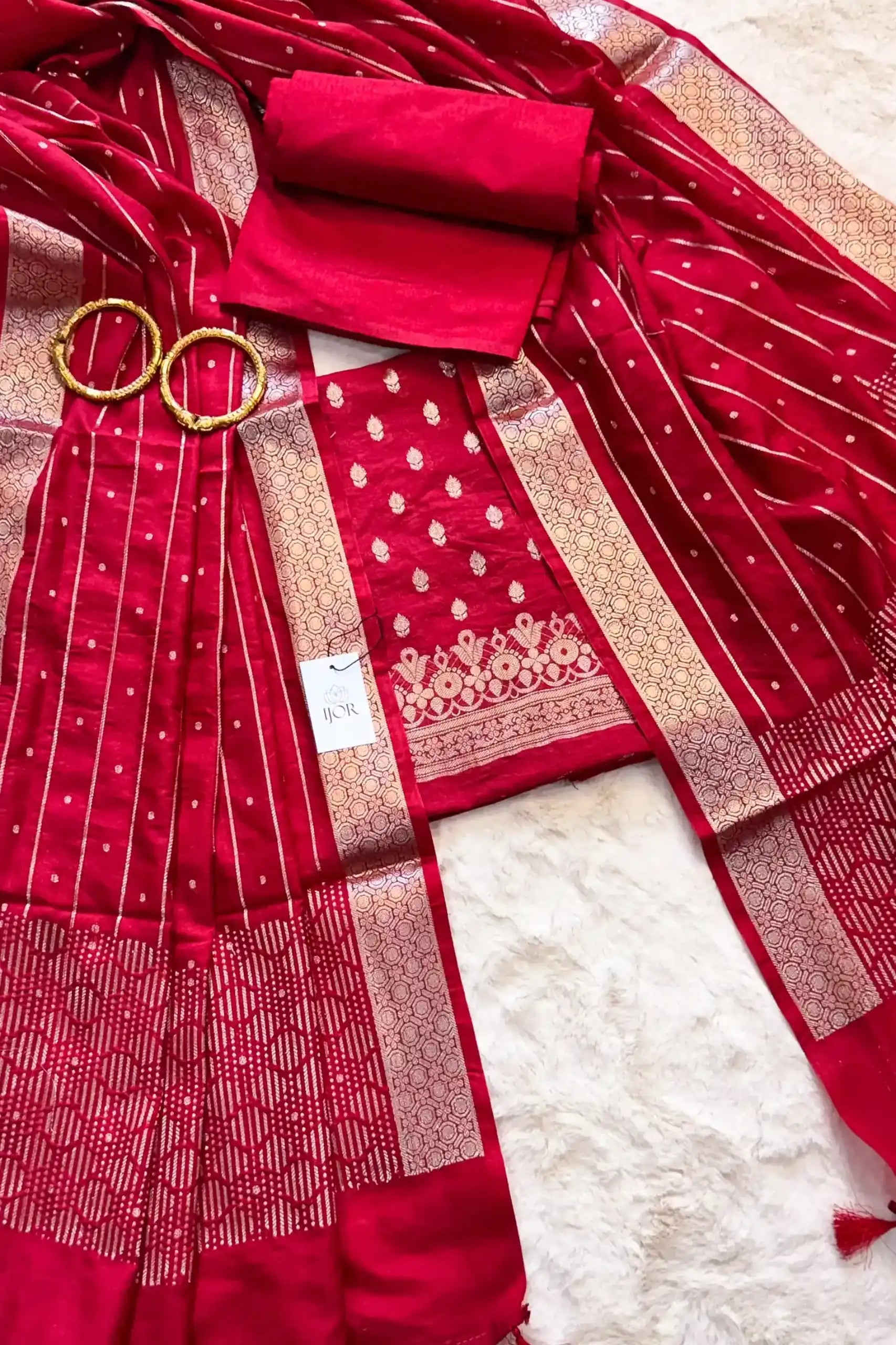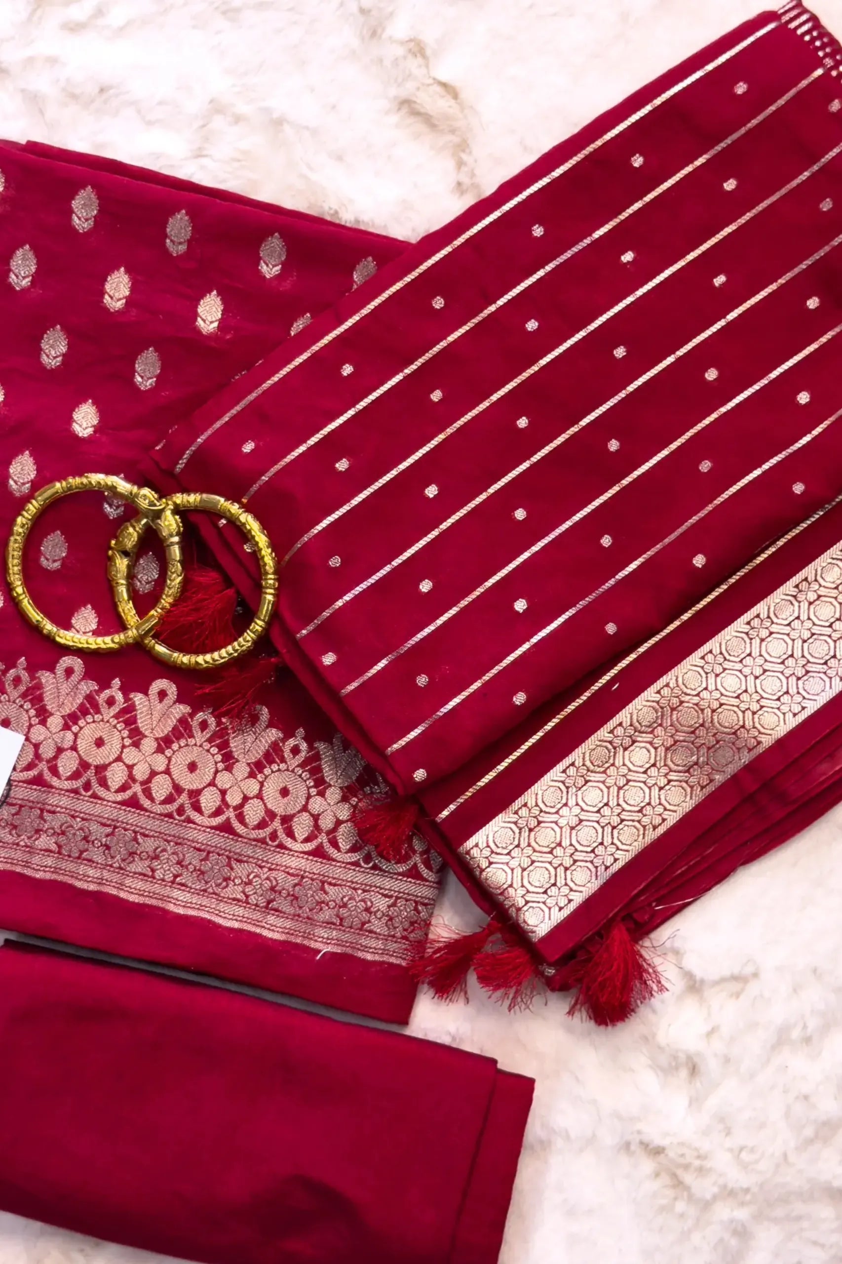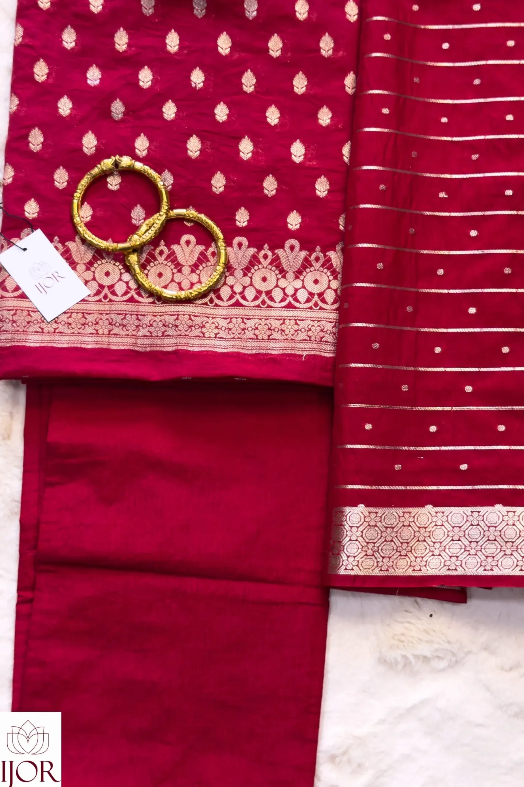 Indulge in timeless luxury with Arakht, a regal unstitched salwar suit crafted in Pure Chiniya Silk. The deep maroon hue is gracefully adorned with intricate Banarasi zariwork, reflecting the heritage and opulence of Indian craftsmanship. Each thread is a celebration of tradition, making this ensemble a perfect choice for festive occasions, weddings, and grand celebrations.