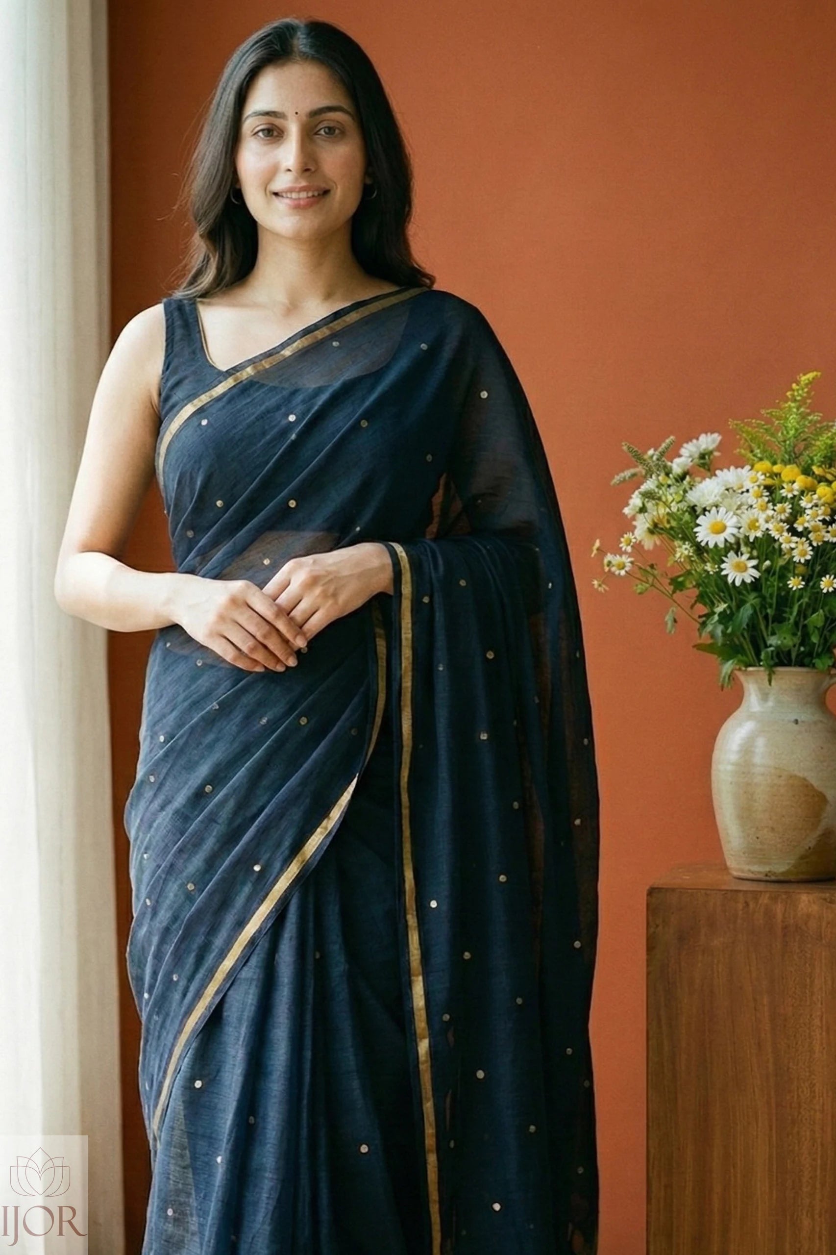 Step into elegance with our Black Pure Mulmul Cotton Saree. Crafted with a fine 120-thread count weave, this saree is luxuriously soft, breathable, and ideal for day-to-night wear. The deep black shade, adorned with subtle golden accents and playful pom-poms, adds a modern twist to its timeless appeal. With its lightweight drape and smooth texture, it offers comfort without compromising on style. Perfect for evening gatherings, casual outings, or cultural events, this saree is a versatile piece for women who appreciate minimal sophistication with handcrafted detailing.