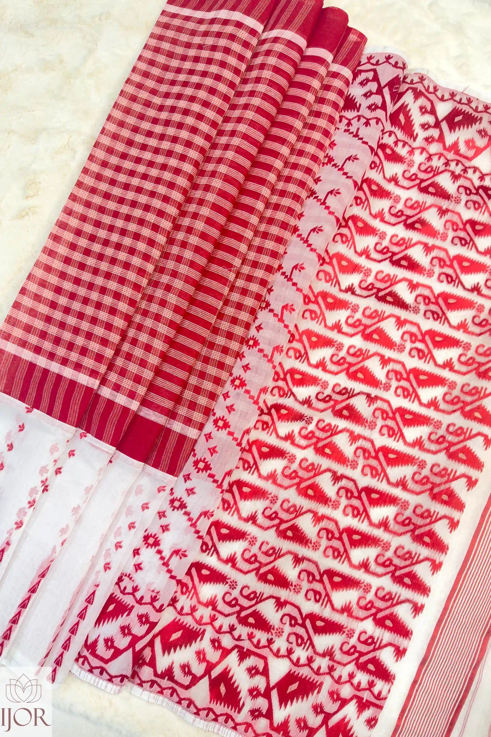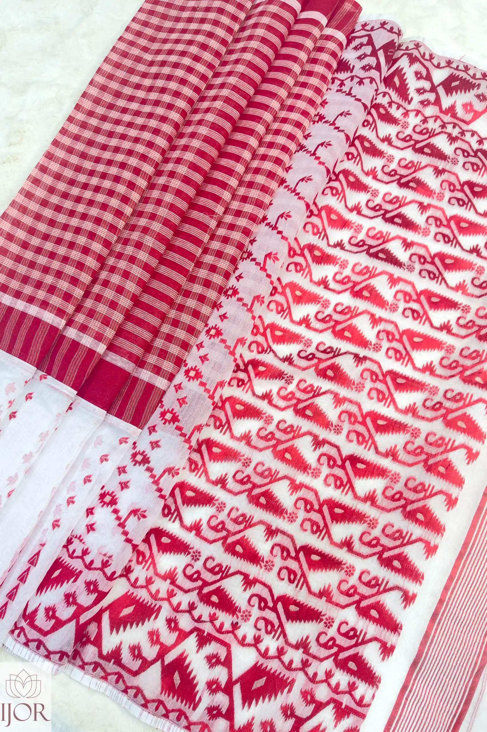 Celebrate timeless tradition with our Red & White Pure Jamdani Saree. Woven by skilled artisans, this saree showcases the heritage of Bengal with its fine threadwork and intricate motifs. The striking red and white combination makes it perfect for cultural occasions, festive gatherings, or traditional ceremonies. Lightweight and breathable, it drapes effortlessly and keeps you comfortable throughout the day. With a length of 5.5 meters, this saree offers elegance in every pleat, making it a must-have for women who value classic handloom weaves that never go out of style.