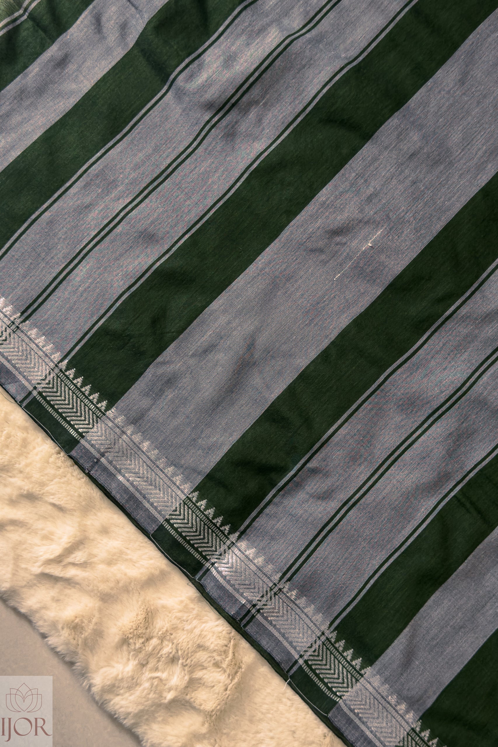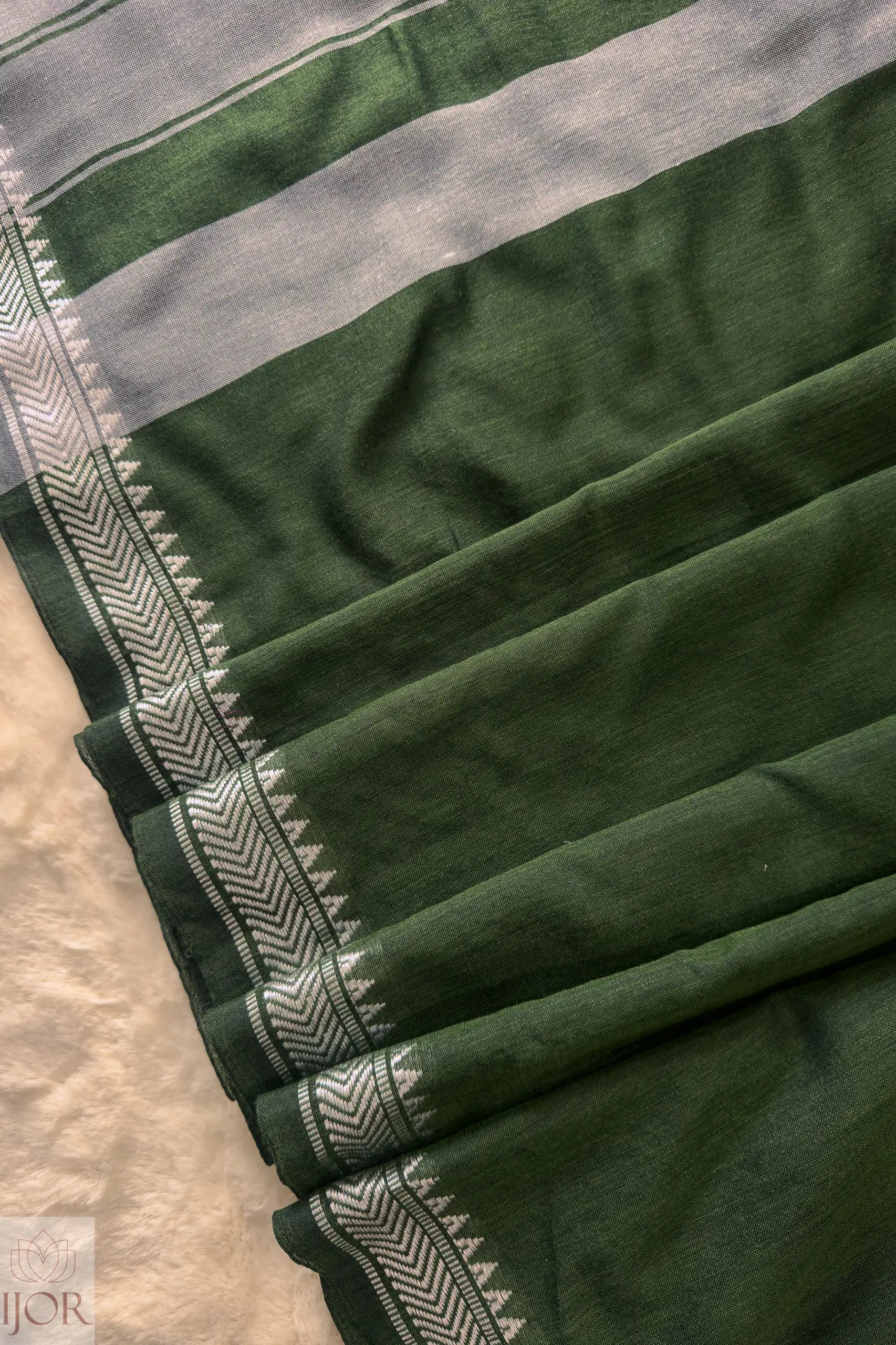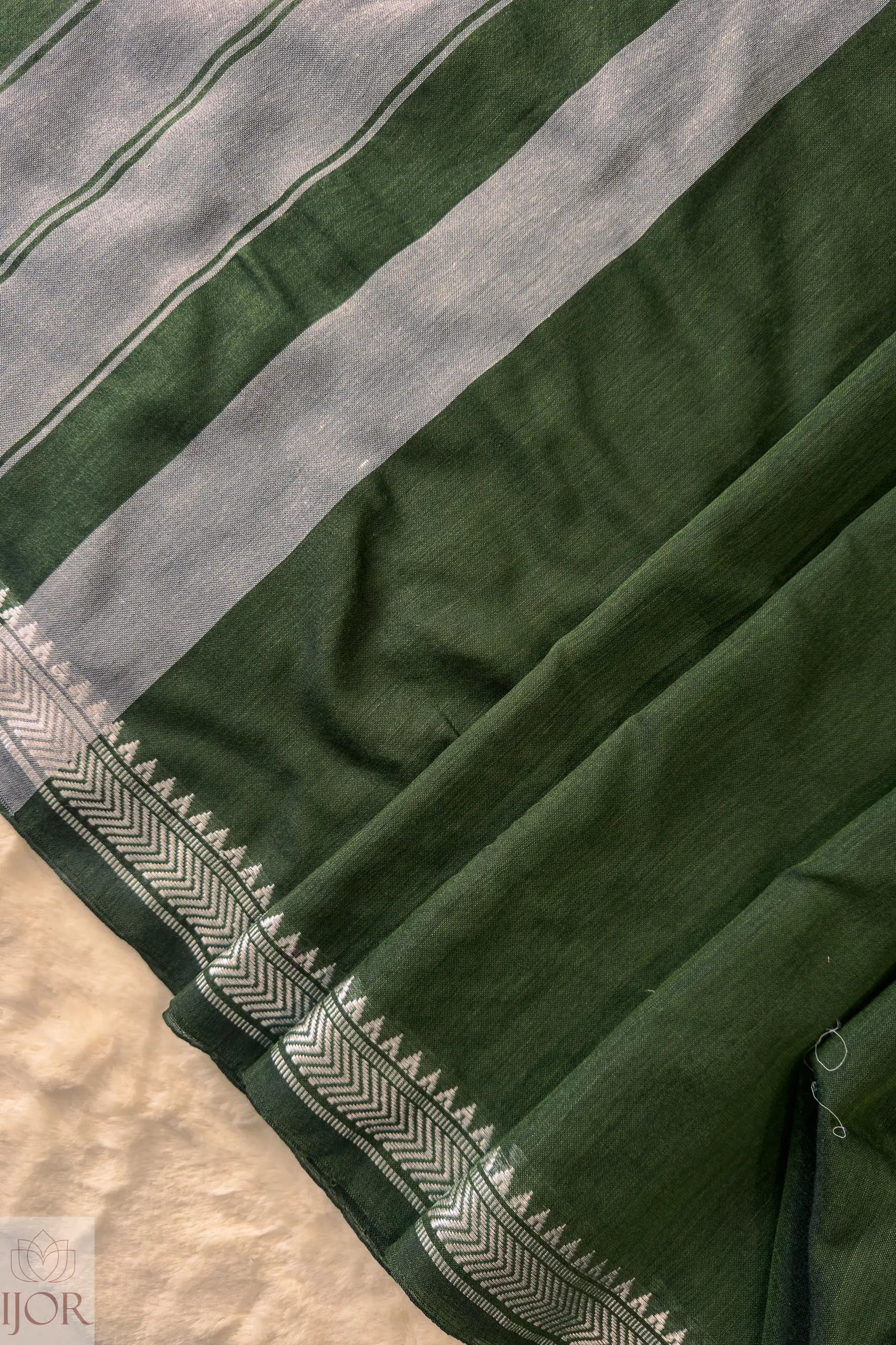 Rediscover the grace of everyday elegance with the Prathama Pure Cotton Green Saree, a distinguished addition to the IJOR collection. Handcrafted from 100% premium pure cotton, this saree features a sophisticated interplay of deep forest green and misty grey broad panels. The highlight of this piece is the delicate silver Zari temple border, which runs along the edges with precision, offering a subtle metallic contrast to the earthy cotton texture.