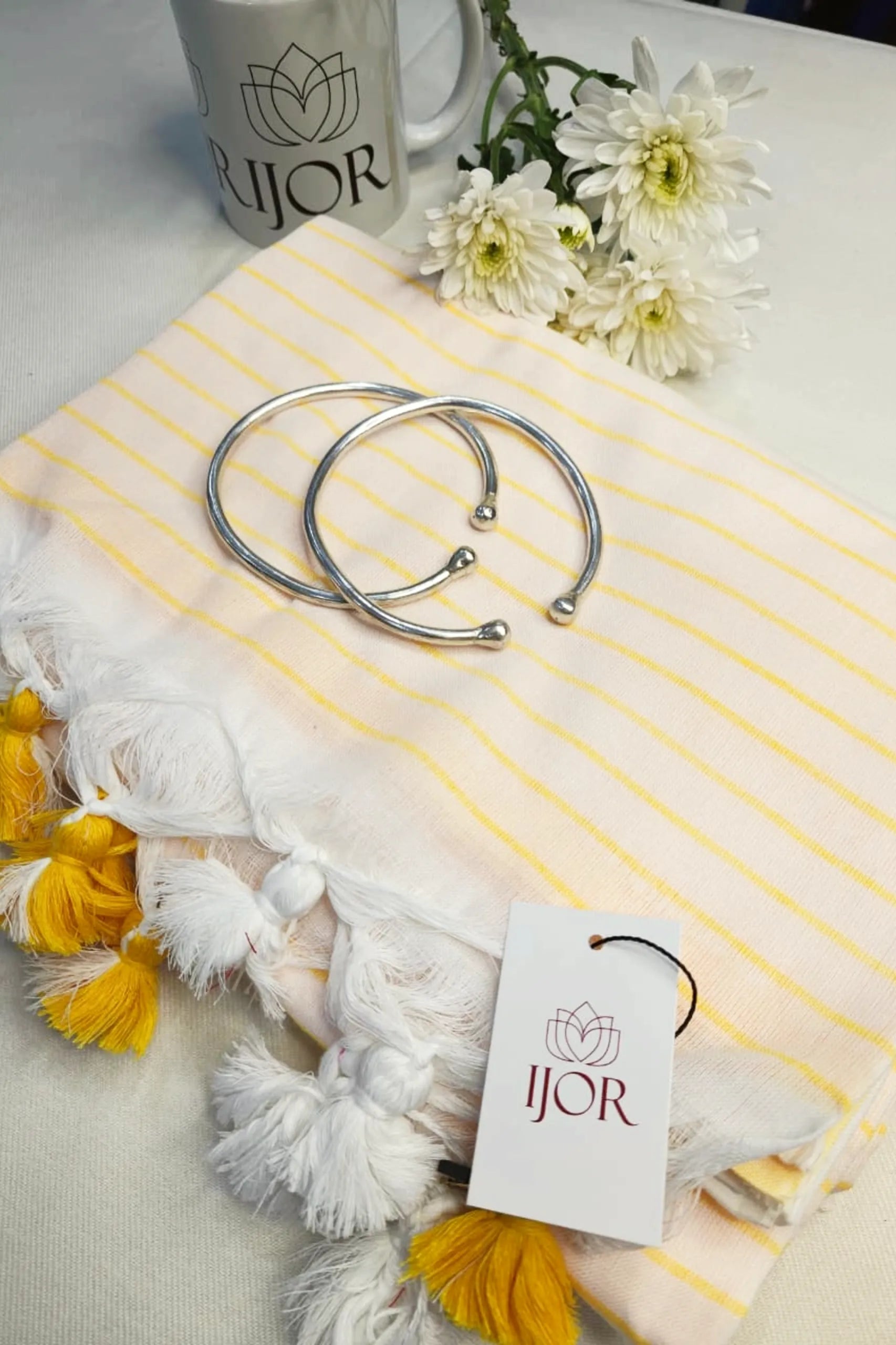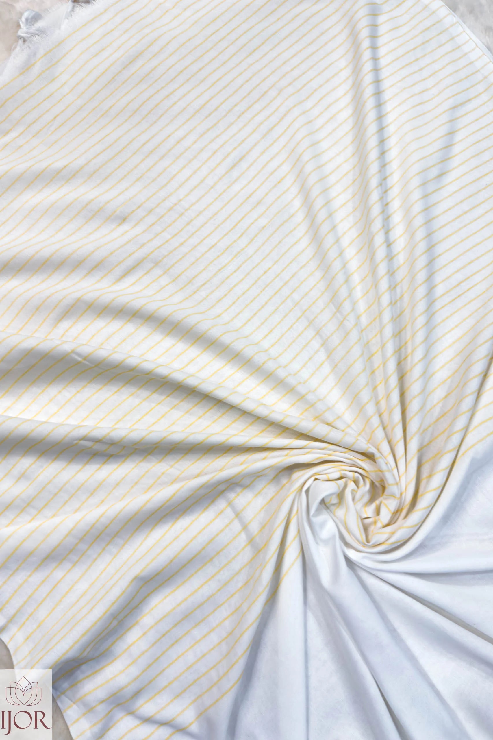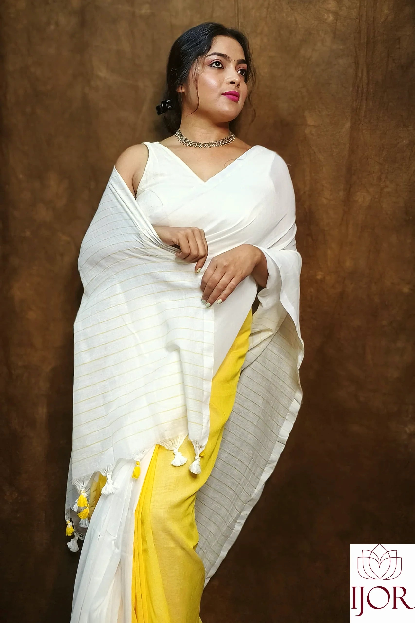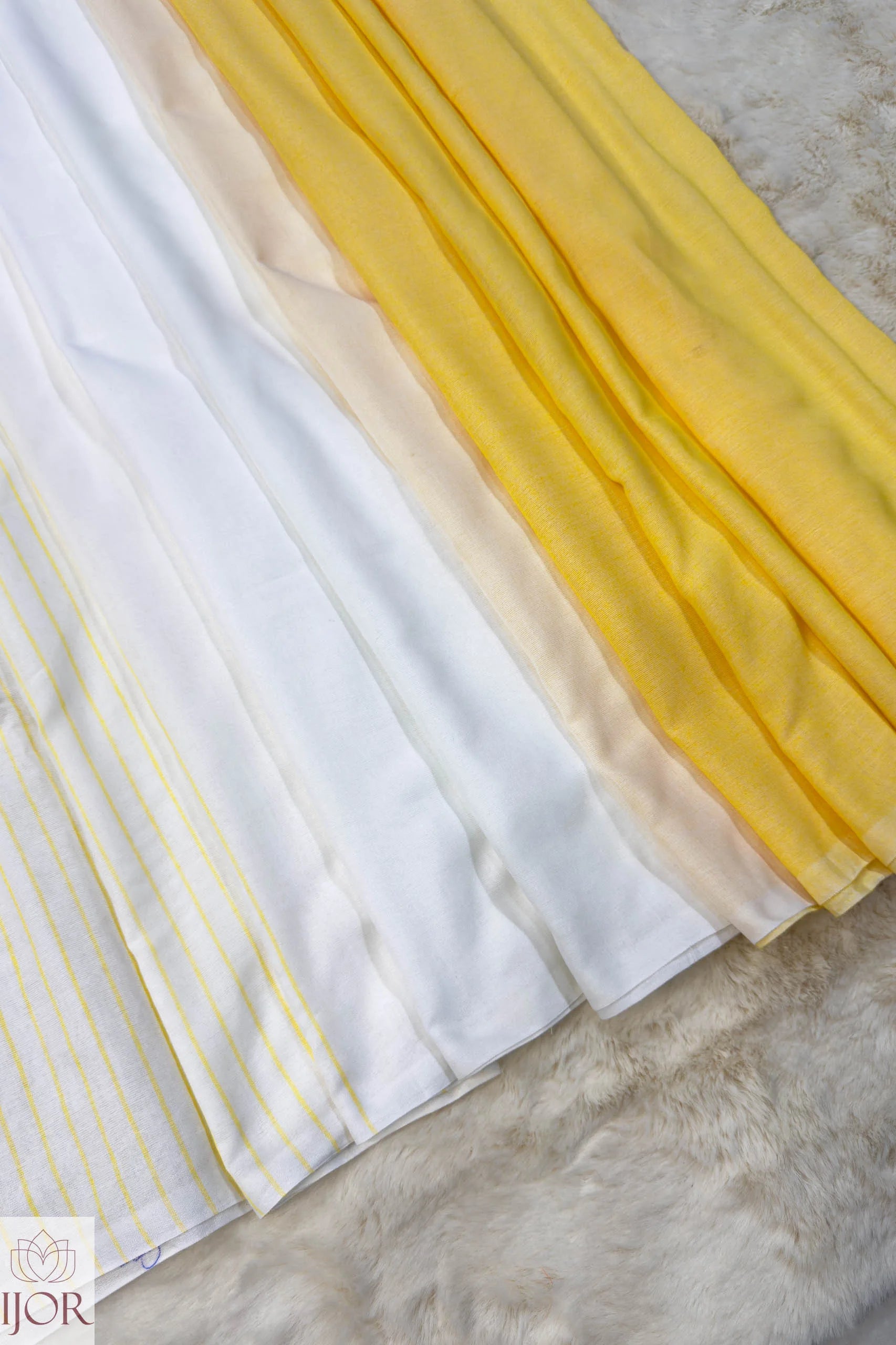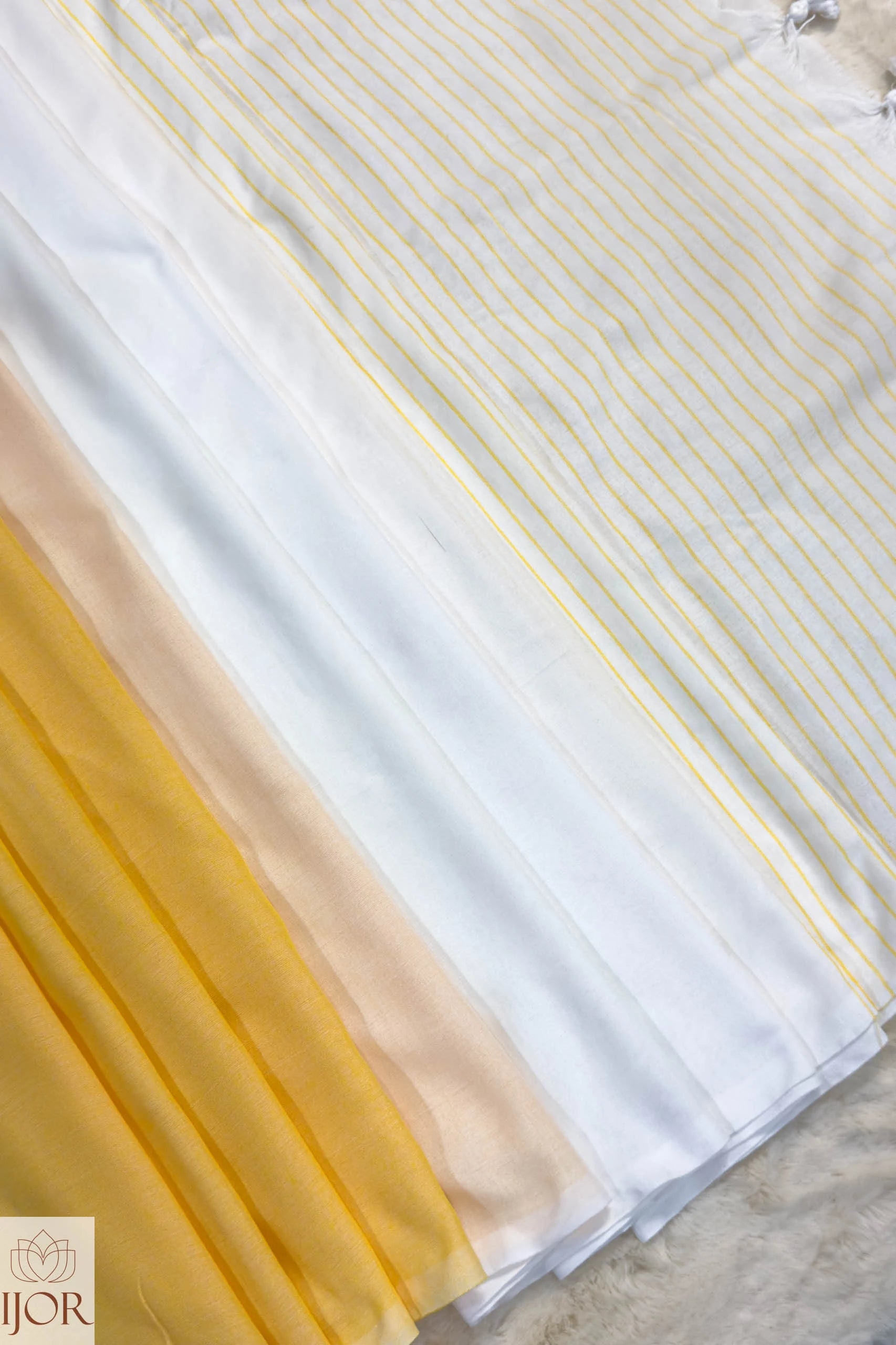Keep your look effortlessly stylish with our Pure Khadi Cotton Saree. Woven from 100-thread count khadi cotton, this saree offers a breathable texture and natural comfort, making it perfect for long wear. The soft off-white base is enhanced with delicate yellow stripes, giving it a subtle yet refreshing charm. Playful pom-poms in white and mustard add a youthful twist, while the included blouse piece completes the ensemble. With a generous 6.5-meter length, it drapes beautifully for everyday wear, festive occasions, or casual gatherings. A perfect pick for women who love minimal elegance with a handcrafted touch.