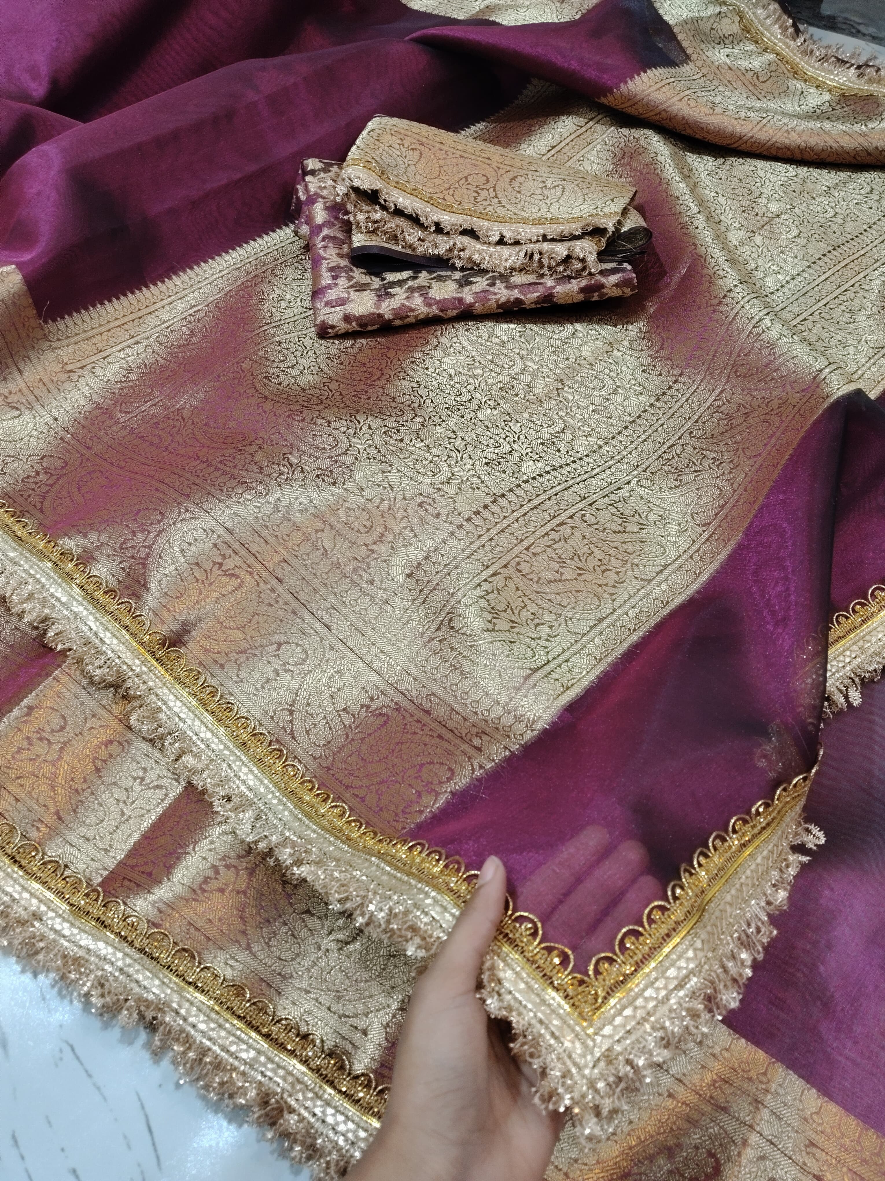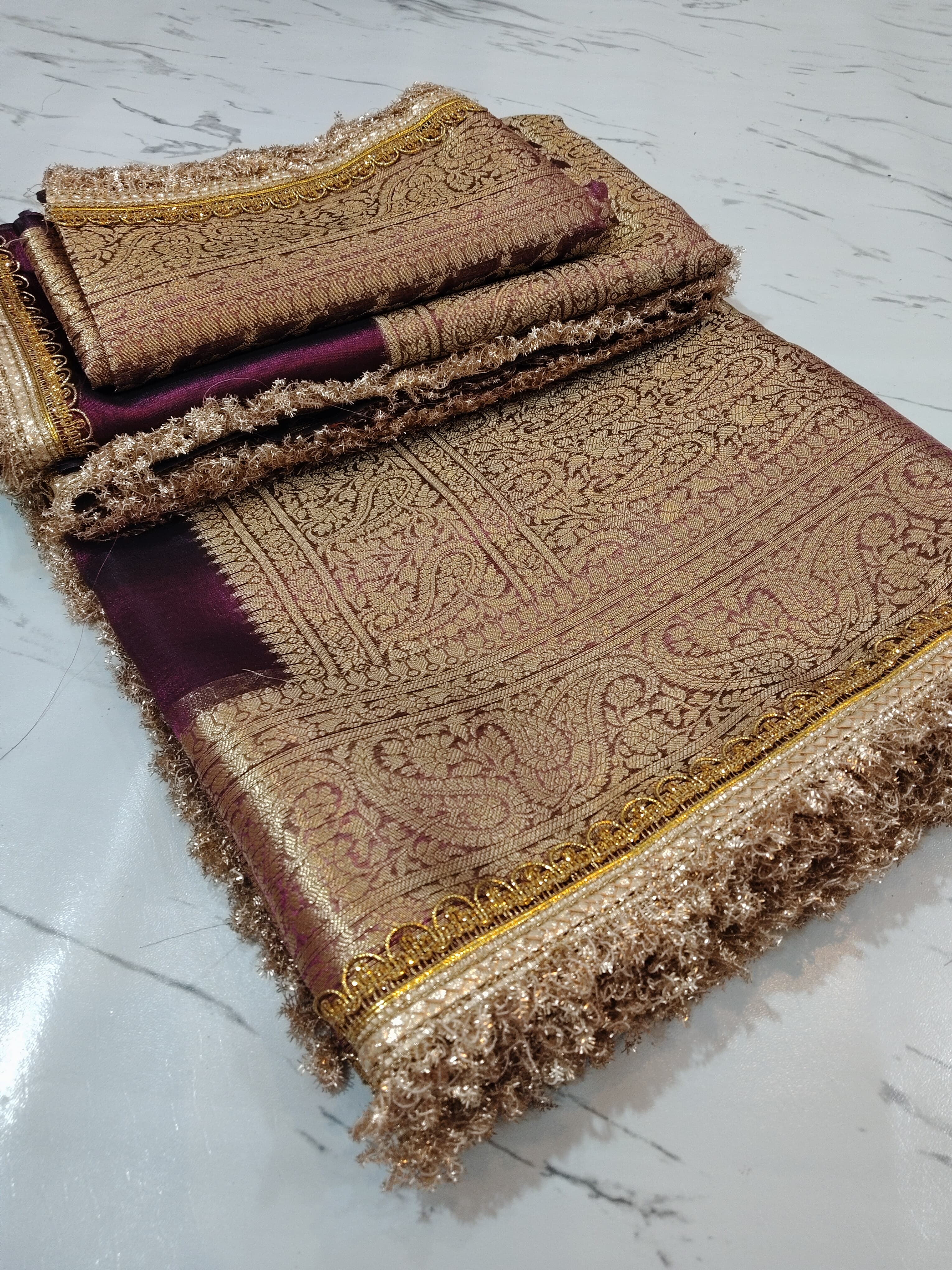 Experience timeless elegance with this Banarasi Soft Glass Tissue Silk Saree, designed for sophisticated charm and grace. Crafted with a delicate all-over lacework border and intricate zari detailing, this saree exudes sophistication and traditional artistry. The lightweight fabric ensures effortless draping, making it comfortable for all-day wear while maintaining a luxurious feel. The beautiful Wine color adds a touch of splendor and richness, making it an ideal choice for weddings, festive occasions, and celebrations. It comes with a matching lace-attached running blouse piece, offering a complete and stylish look. Whether styled traditionally or with a modern twist, this saree is a must-have in every wardrobe. Drape yourself in this exquisite Banarasi masterpiece and let its timeless beauty become a treasured addition to your ethnic collection.