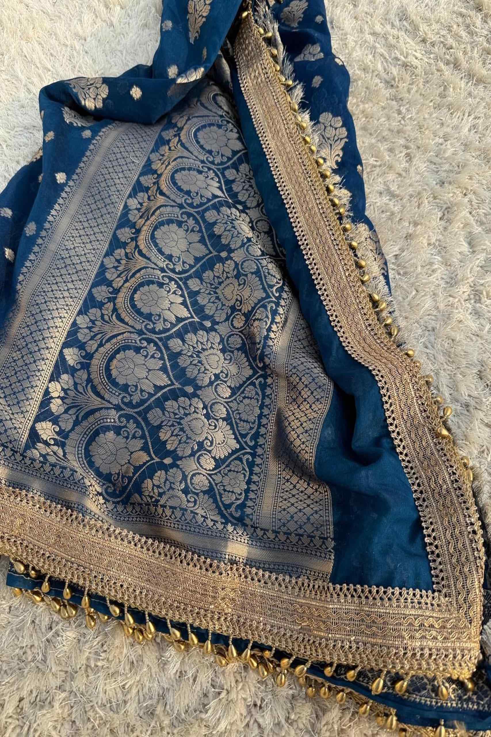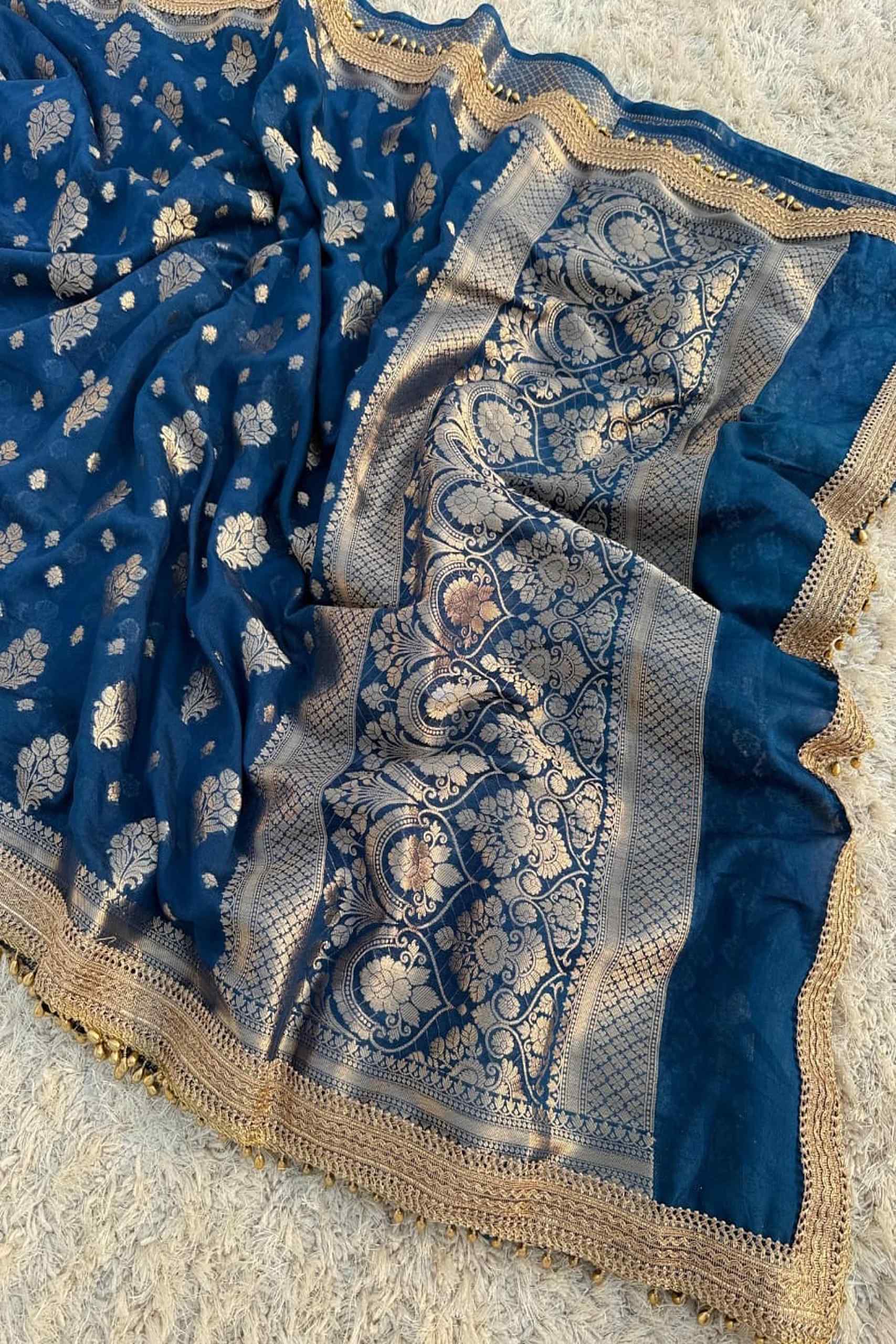 Nishabi the Celestial Blue is a stunning Banarasi Soft Khaddi Georgette Silk saree that embodies timeless elegance and sophistication. This exquisite piece features an all-over buti weaving design that adds a touch of traditional charm and intricate craftsmanship. The saree is beautifully complemented by a premium lace-work border, elevating its sophisticated appeal and creating a refined silhouette. Measuring 5.5 meters, this saree drapes with graceful fluidity, offering a luxurious feel that moves beautifully with you. It comes with a plain blouse piece adorned with a matching lace-attached border, ensuring a cohesive and elegant ensemble. Perfect for weddings, festive celebrations, and special occasions, Nishabi the Celestial Blue is ideal for those seeking a unique and opulent addition to their wardrobe. Drape yourself in this celestial masterpiece and let its timeless beauty become a treasured piece in your ethnic collection.