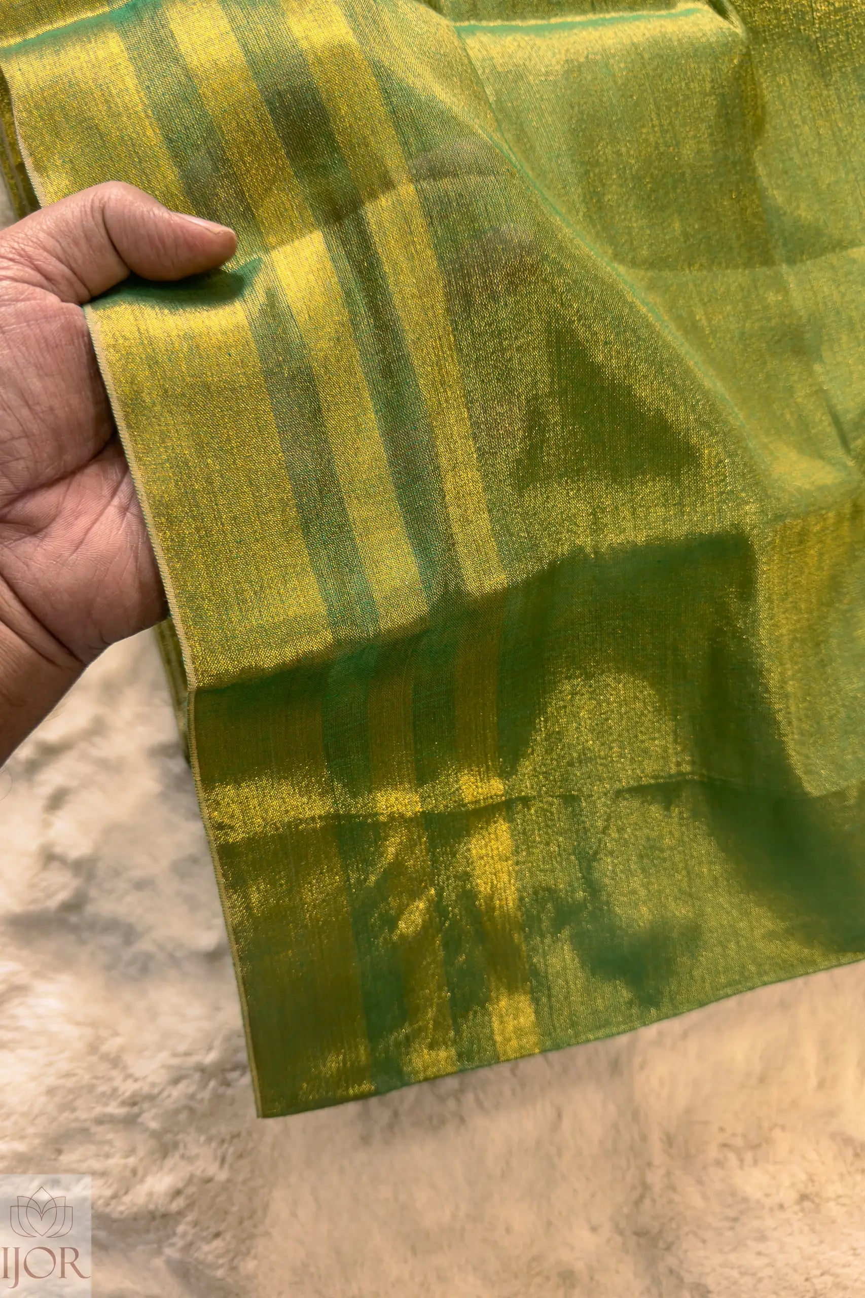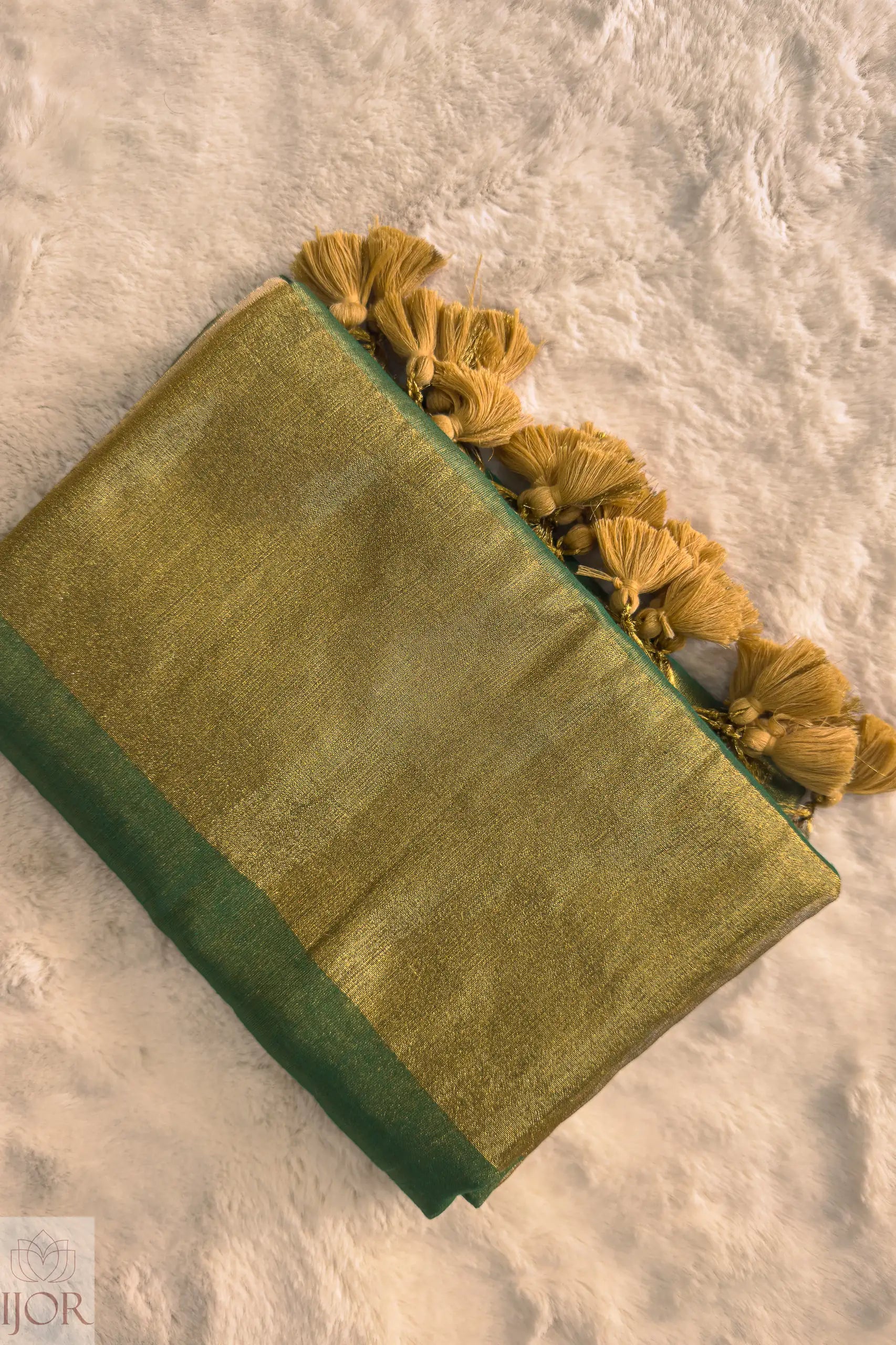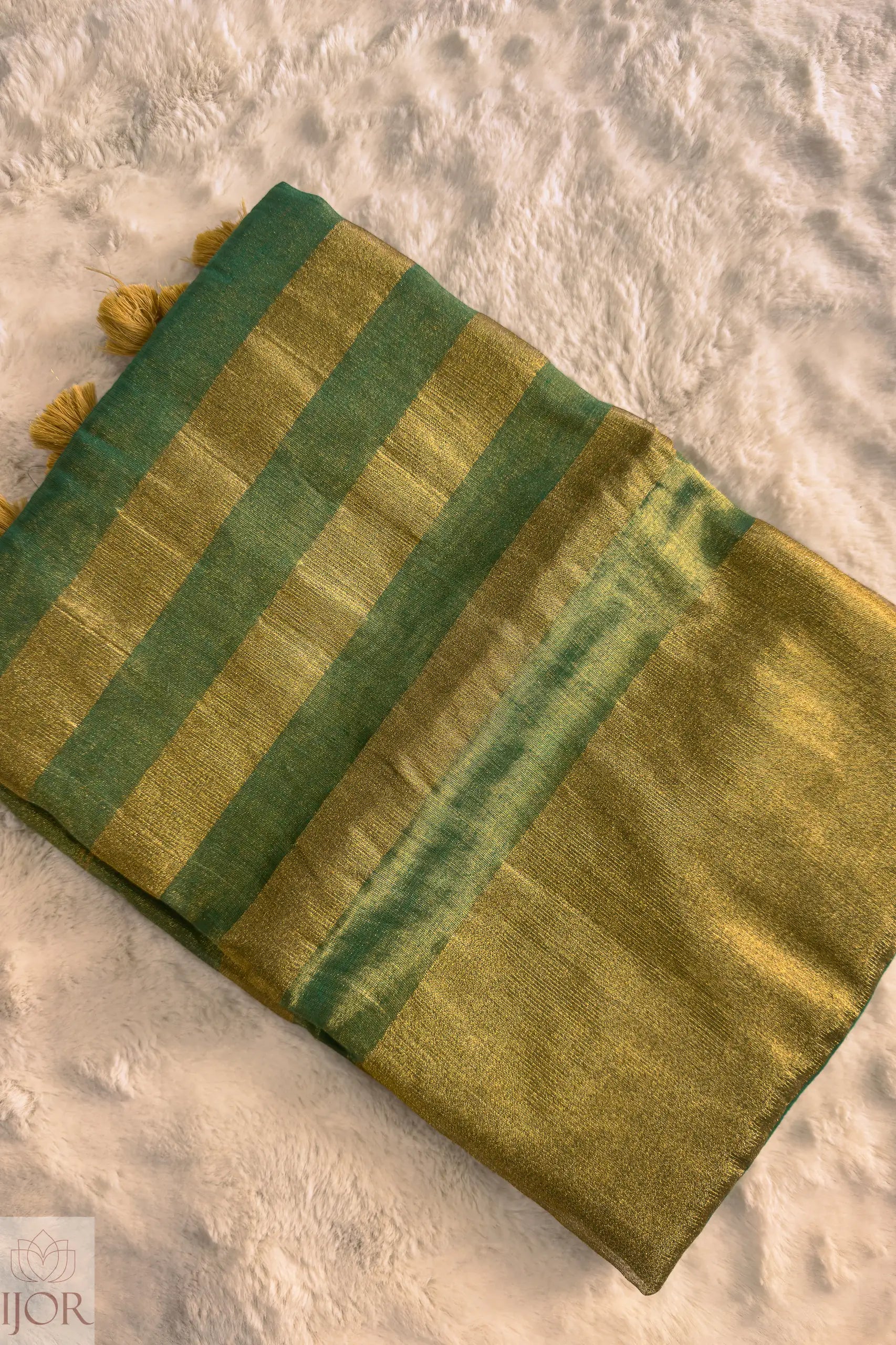 Step into regal brilliance with the Rajasi Panna Green Golden Zari Saree, a crown jewel in the IJOR collection. This saree is a masterclass in texture, blending the earthy comfort of pure cotton with the ethereal shimmer of tissue silk. The body is drenched in a deep Panna (Emerald) Green, a color synonymous with prosperity and royal heritage.