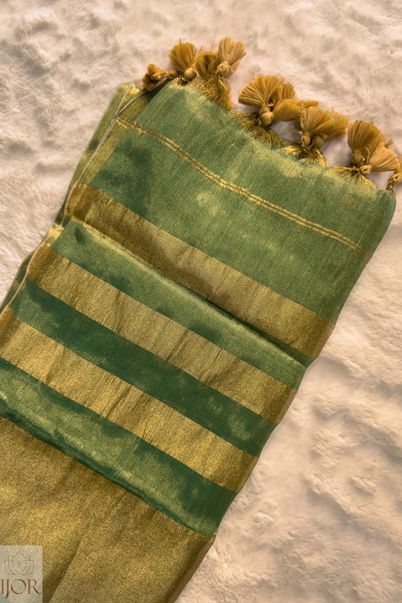 Woven across the length are bold horizontal Golden Zari stripes, creating a structured, architectural aesthetic that captures light beautifully. The pallu is meticulously finished with hand-crafted golden tassels, adding a playful yet sophisticated movement to the drape. Lightweight, breathable, and unmistakably luxurious, this saree is designed for the woman who commands attention with grace and celebrates India's rich handloom heritage.
